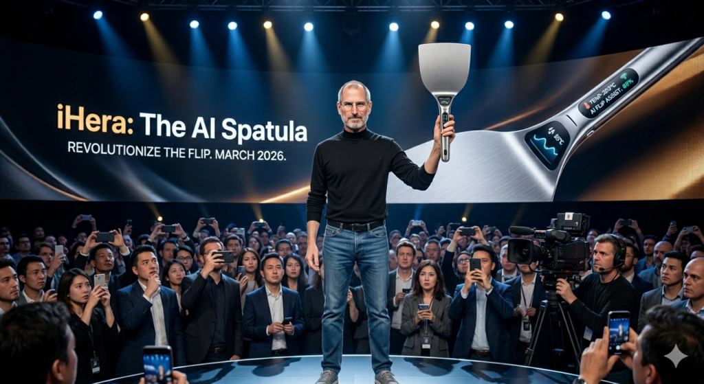 「iHera / Revolutionize the Flip.」というキャッチコピーで、プレゼンの舞台に立つ男のビジュアルまで用意しました。温度センサー搭載、AI焼き加減アシスト機能付き。もちろんお好み焼きをひっくり返せます。