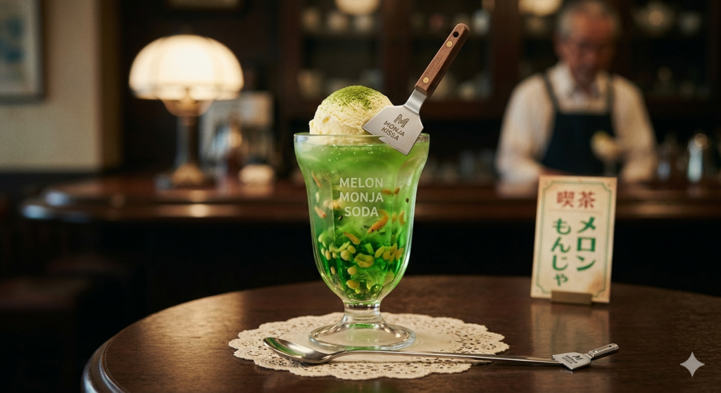 昭和レトロな純喫茶の雰囲気の中、グラスに注がれる緑色のソーダ。バニラアイスが乗って、小さなヘラが刺さっている。メニューには「メロンもんじゃ」の文字。