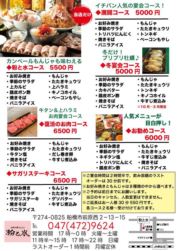 | 粉と水 | 5,500円 | カンペールもんじゃ | 名物を楽しみたい |