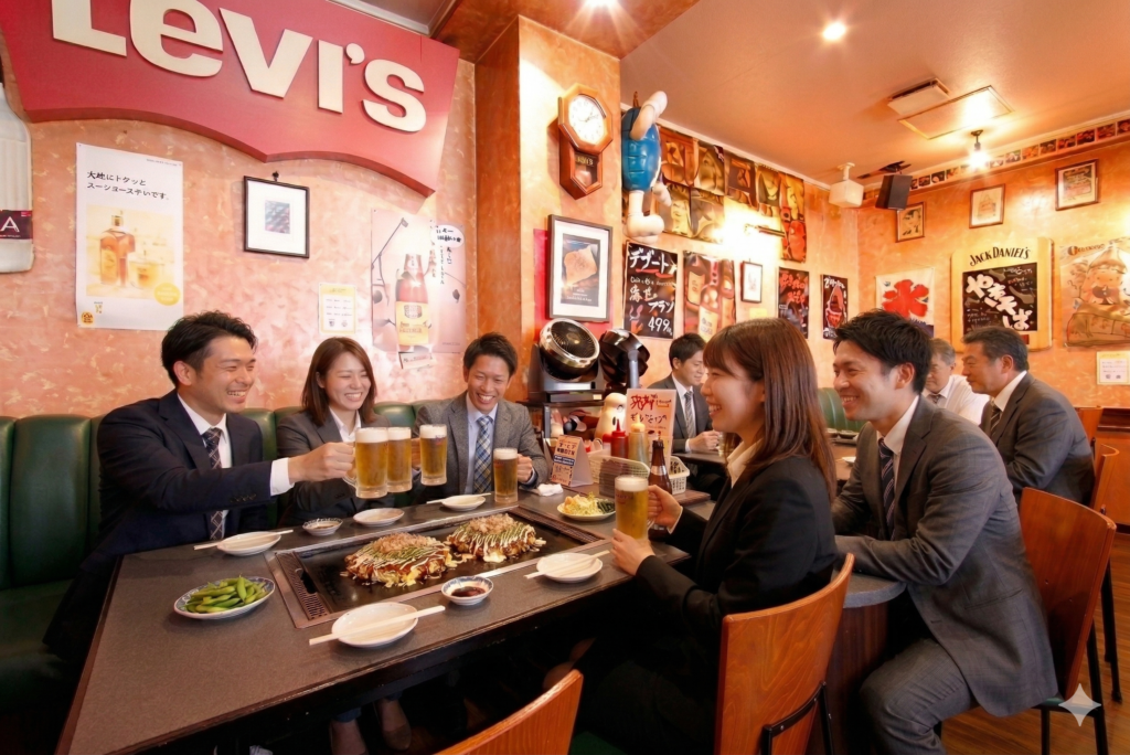ちゃんとした料理とお酒が揃っていて、でも鉄板を囲むカジュアルな雰囲気。上司も新入社員も、自然と同じ目線になれる場所です。