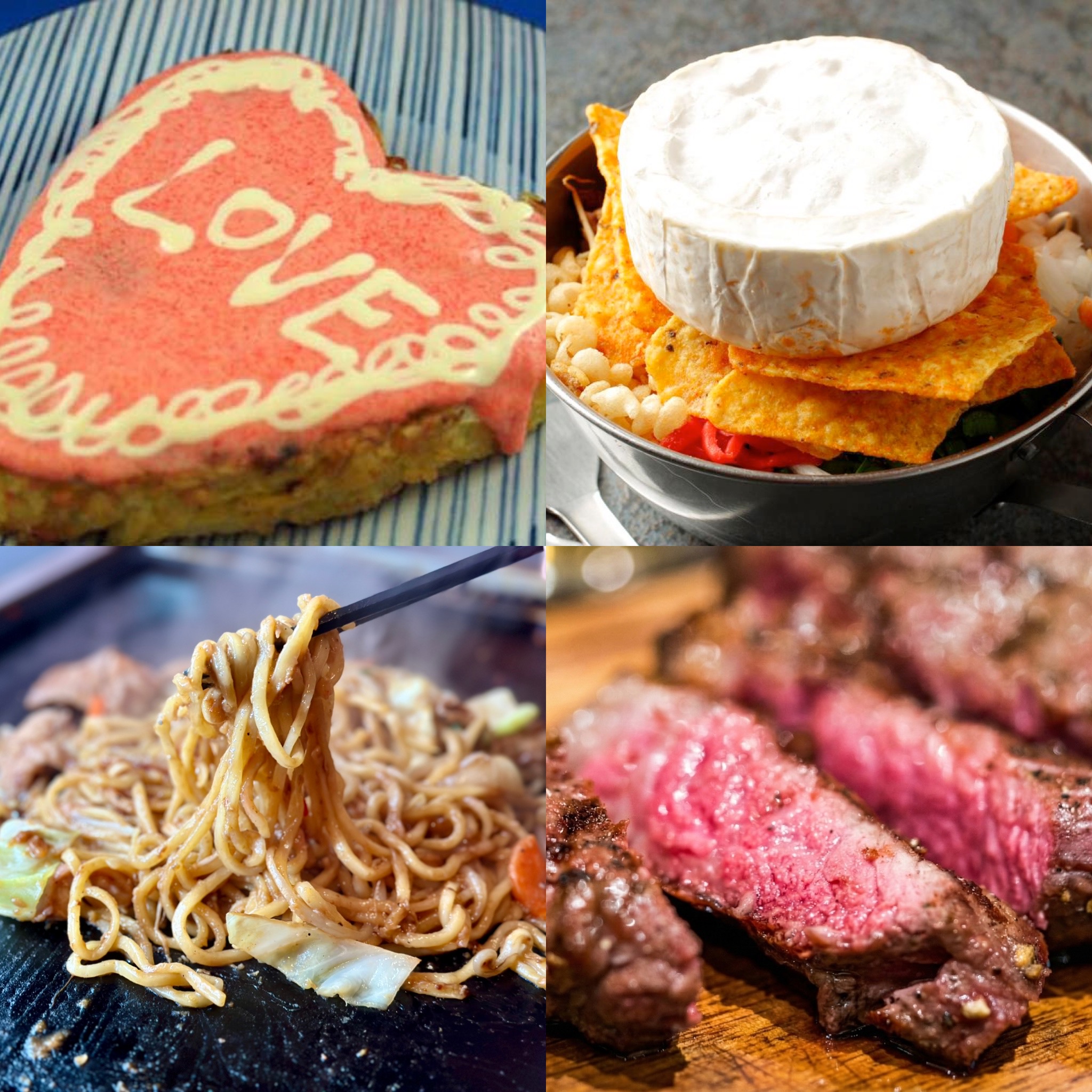 バレンタインセットは、お好み焼き・もんじゃ焼き・焼きそば・サーロインステーキと、粉と水の人気メニューを集めた、豪華な内容です。