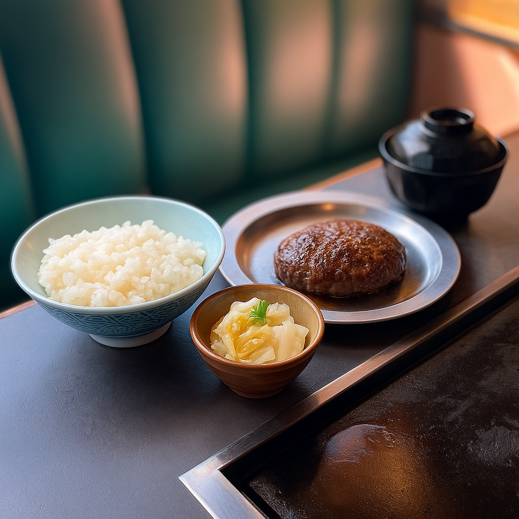 - 内容:手作りハンバーグ(特製ソース)+ ご飯 + 味噌汁 + サラダ