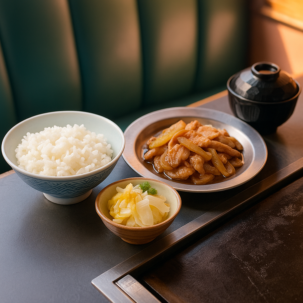 - 内容:豚の生姜焼き + ご飯 + 味噌汁 + サラダ