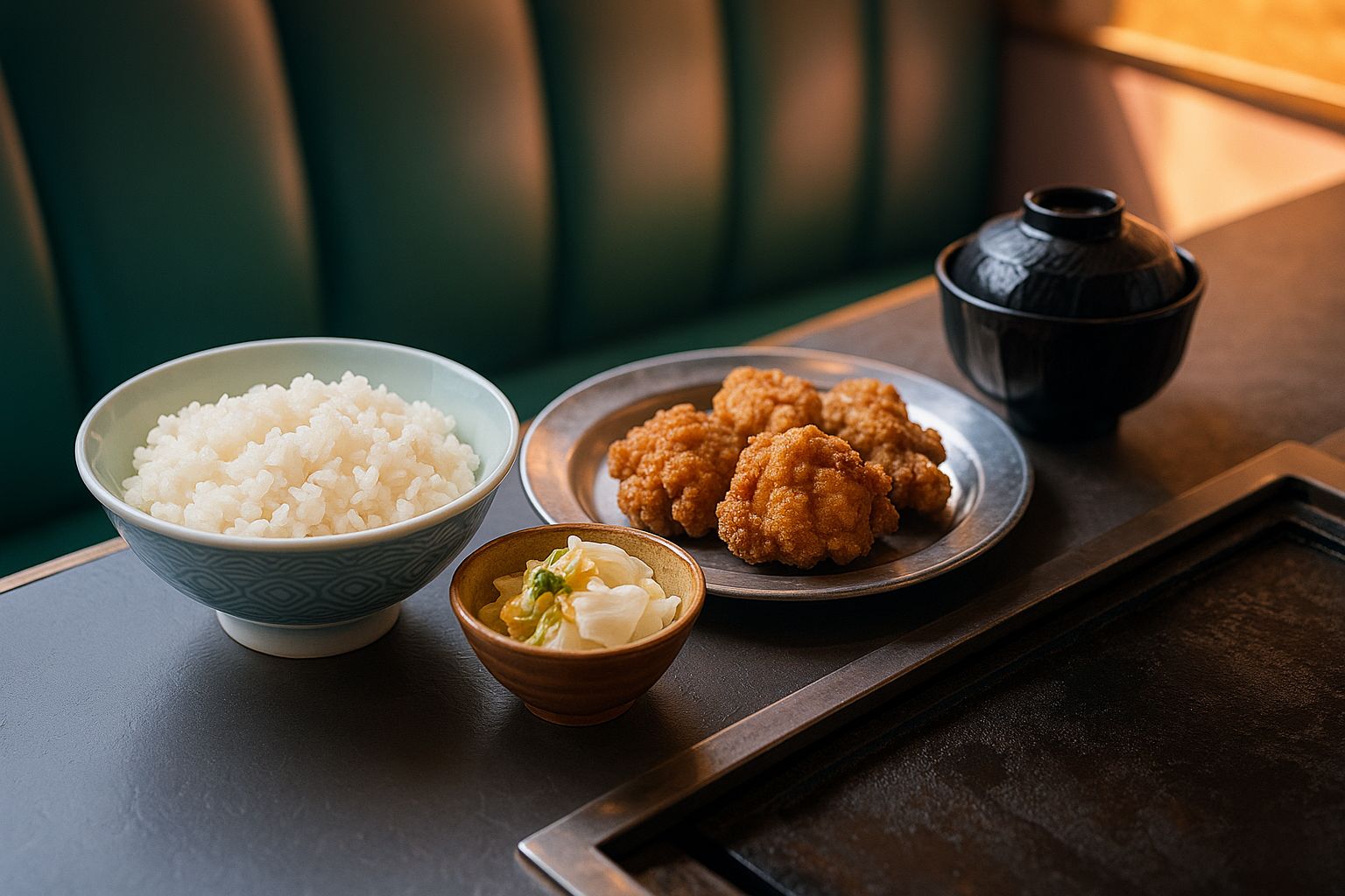 - 内容:特製唐揚げ + ご飯 + 味噌汁 + サラダ