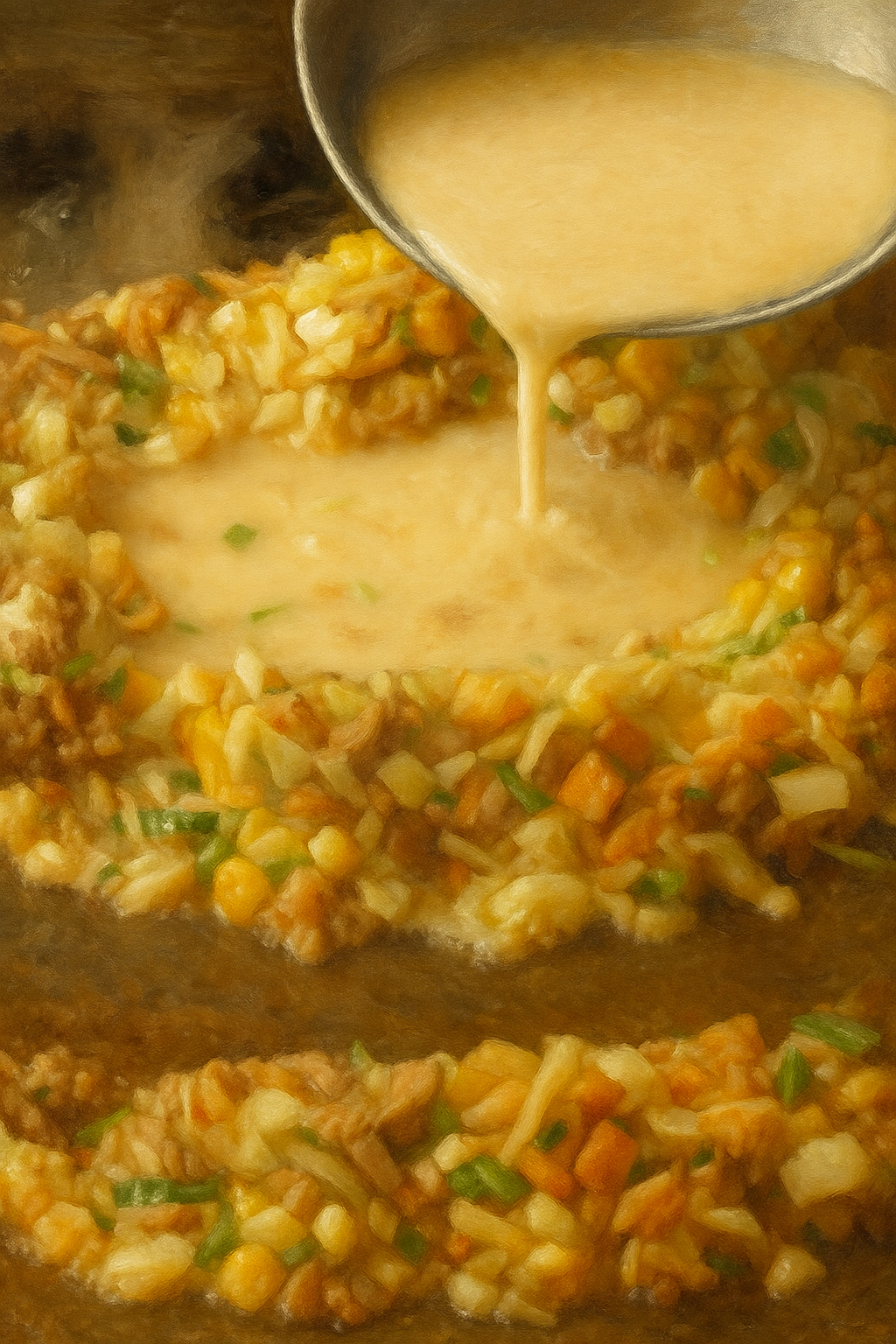 出汁が注がれる瞬間。 湯気が立ち上る様子。 柔らかな光に包まれる料理。