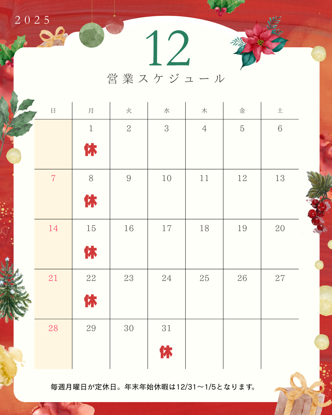 ✅ 毎週月曜日は定休日(12/1, 8, 15, 23)
